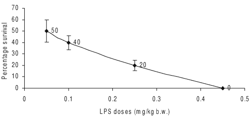 Doses of LPS from 50 mg/kg. b.w. onwards administered to Balb/c mice rendered increasing mortality. LPS dose (450 mg/kg, b.w.) to mice induced 100% mortality as compared to control group (Fig. 2).