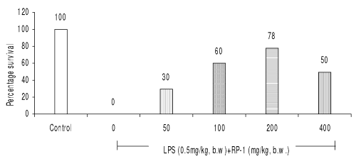 RP-1 (200 mg/kg b.w., i.p.) administered 1 h before LPS (0.5 mg/kg b.w.) challenge rendered maximum survival (78%) (Fig 3).