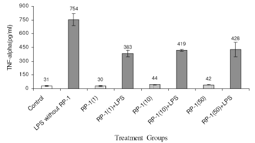 Figure 6: Effect of different doses of RP-1 (mg/ml; mentioned in parenthesis) administered one hour before LPS (5 mg/ml) treatment to peritoneal macrophages (ex vivo culture from female Balb/c mice). The supernatant was investigated for TNF-a secretion 48 h after treatment. Each bar represented mean+S.D of three repeats.