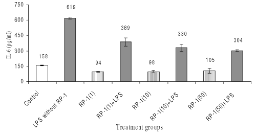 Figure 7: Effect of different doses of RP-1 (mg/ml; mentioned in parenthesis) administered one hour before LPS (5 mg/ml) treatment to peritoneal macrophages (ex vivo culture from female Balb/c mice). The supernatant was investigated for IL-6 secretion 48 h after treatment. Each bar represented mean + S.D of three repeats.
