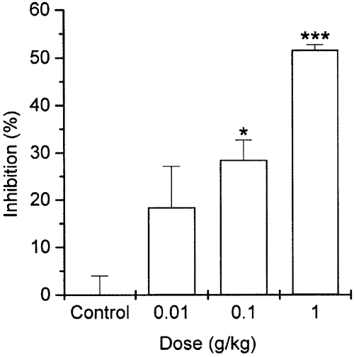 Figure 2: Effect of GBIT extract on 48 h PCA in mice. GBIT extract was administered orally 1 h prior to the challenge with antigen (DNP-HSA). Each datum represents the mean+S.E.M. of three independent experiments. *P<0.05, ***P<0.001; significantly different from the control value.