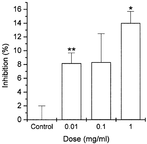 Our results showed that pretreatment of the cells with GBIT extract resulted in inhibition of IL-6 secretion. Inhibitory effect of GBIT extract was significant at the dose of 0.01 and 1 mg/ml (Figure 3). IL-6 production value at the doses of 0.01-1 mg/ml was 15.11±0.24, 15.08±0.66 and 14.17±0.27, respectively. Control and spontaneous values were 16.41±0.40 and 0.46±0.20.
