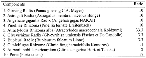 GBIT is a complex prescription that is known to enhance spleen and stomach-qi on the basis of Oriental medicine theory (1). As a result of reinforcement of spleen and stomach-qi, GBIT can also reinforce wei-qi which guards the surface of the body against exopathogen (31,32). The main components of GBIT are known in the previous reports. Ginseng radix includes ginsenoside-Rb1 (G-Rb1), G-Rg1, and G-Ro (33), Astragali radix includes calycosin (34), Angelicae gigantis radix includes decursin (35), Pinelliae rhizoma includes beta-sitosterol (36), Atractylodis rhizoma alba includes atractylenolide I (37), Glycyrrhizae radix includes glycyrrhizin (38), Bupleuri radix includes saikosaponin a (39), Cimicifugae rhizoma includes acetylshengmanol xyloside and cimicifugoside H-1 (40), Aurantii nobilis pericarpium includes obacunone glucoside and nomilin glucoside (41), and Poria includes pachyman (42), respectively. It was, however, difficult to identify and separate specific compound through HPLC system from GBIT extract that consists of above ten traditional drugs.