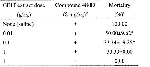 As shown in Table 2, an oral administration of saline as a control induced a fatal reaction in 100% of each group. When the GBIT extract was orally administered at concentrations of 0.01-1 g/kg 1 h before compound 48/80 injection, the mortality was dose-dependently reduced (Table 2).