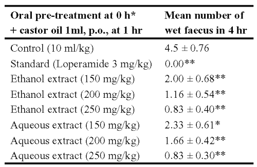 The ethanol and aqueous extracts at doses of 150, 200, 250 mg/kg showed significant (P < 0.001) reduction in the number of defecations over four hours when compared to that of untreated control rats; the activity was similar to that of loperamide (3 mg/kg), the standard anti-diarrhoeal agent. Both ethanol and aqueous extracts delayed the onset of diarrhoea and 100 and 80% of rats were protected against castor oil-induced diarrhoea at four hour, respectively.
