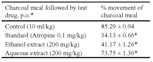 The ethanol and aqueous extracts decreased propulsion of the charcoal meal through the gastrointestinal tract at the oral dose of 200 mg/kg; as compared with control group (0.5% Tween 80). A similar reduction in the gastrointestinal transit of charcoal meal in rat was achieved with the intraperitoneal injection of atropine sulphate (0.1 mg/kg) (Table 3).