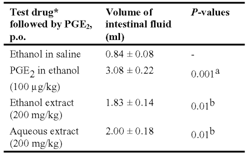 Both extracts significantly inhibited PGE2 induced enteropooling in rats at an oral dose of 250 mg/kg (Table 4).