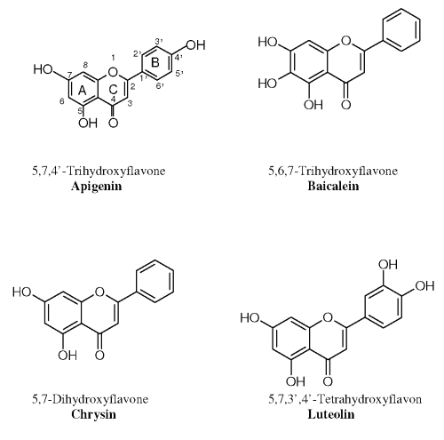 All the calibration curves for Apigenin, Baicalein, Chrysin and Luteolin after the hydrolysis and extraction treatment were also linear with correlation coefficients greater than 0.995. The absolute extraction recoveries for the four flavones were within the range of 73 to 88 %.