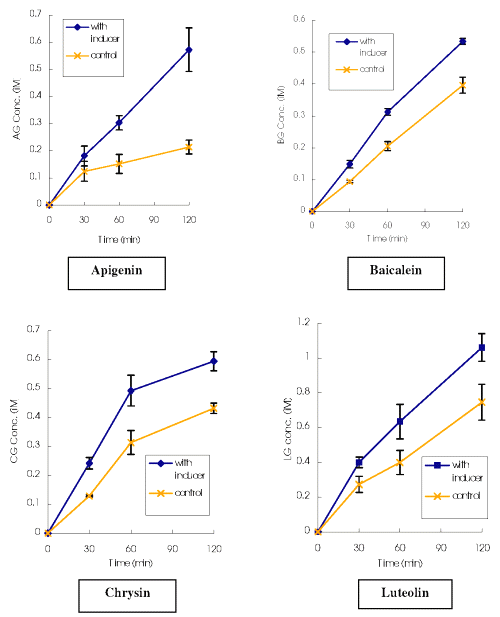 All calibration curves of flavones with authentic compounds were found to be linear with correlation coefficients greater than 0.999. At the lowest concentration of 0.1 mM, all selected flavones produced peaks at least 3 times greater than that of the background.