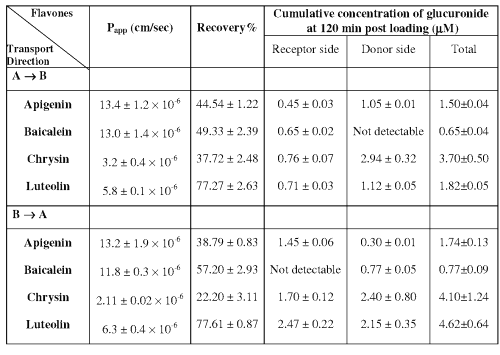 Transport and glucuronidation of selected flavones in Caco-2 monolayer models. The Papp values of Apigenin and Baicalein fell into the range of 10-5 cm/sec, which implies that they would be well absorbed in gut due to their high lipophilicities (25). The Papp values of the 4 flavones obtained from both directional transport studies were similar. Our calculated Papp from apical to basalateral for Chrysin differs a bit from the observation by Walle et al (15), which may result from the differences in Caco-2 cell passage number, cell culture condition, transport medium and the use of co-solvent in the loading solution (22). However, our observation for Luteolin differs from that obtained by Tammela (26) et al, in which Luteolin showed no apical to basalateral transport. This could be due to the different detection capability of Luteolin from transport study using different loading concentrations, different size of the transwell insert.