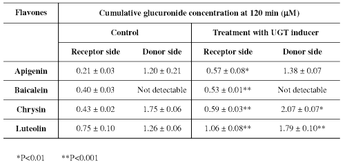 It was also observed (Table 2) that the amounts of glucuronide generated on the donor side of Chrysin and Luteolin are also significantly higher in the UGT inducer-treated model than the control at 120 min, whereas this trend towards increase was not obvious for Apigenin and Baicalein.