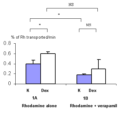 Figure 1: Effect of dexamethasone (Dex) on the clearance of rhodamine 123 (Rh), expressed as the percentage of rhodamine 123 transported across rat everted gut sacs without (1A, n=3) or with a P-gp blocker (verapamil) (1B, n=3) per minute. Grey columns represent rhodamine 123 transport in control rats non pre-treated with dexamethasone (K) and white columns represent rhodamine 123 transport in rats pre-treated with dexamethasone (40 mg/kg during 3 days) (Dex) (m +/- s.d.). *: p<0.05 ; NS : non significant.