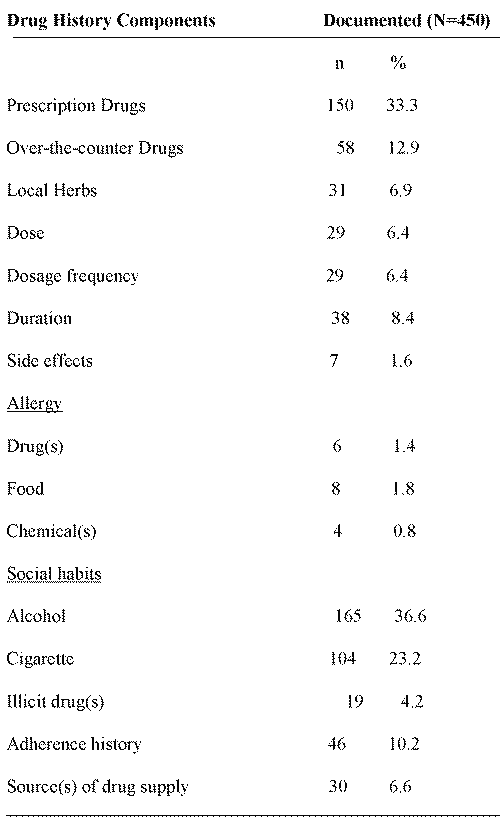 Past use of prescription-only, over-the-counter and herbal drugs were documented in 33%, 12.9% and 6.9% respectively. The dose, dose frequency and duration of use were documented in only 6.4%, 6.4% and 8.4% of patients, while side effects experienced, prior to admission, was documented in only 1.6%. Allergies to drug(s), food and chemical(s) were documented in 1.4%, 1.8% and 0.8% respectively. Furthermore, documentation of history of social drug use (alcohol, cigarette and illicit drug(s)) were done in 36.6%, 23.2% and 4.2% respectively; while patients' adherence history was documented in 10.2% of study sample. Source(s) of supply of all drugs patients had used in the past was documented in only 6.6% of patients.