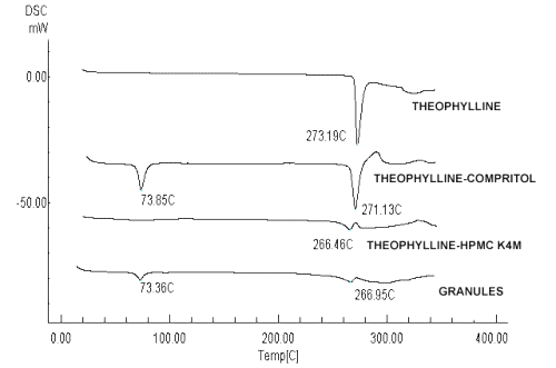 Figure 1 shows an example of the thermograms obtained for theophylline, its physical mixture with Compritol® or HPMC K4M and the corresponding granules.