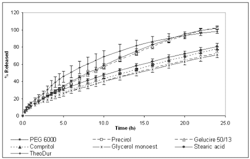 The type of excipient influenced the rate and extent of drug release from melt granulation based matrix tablets. Comparison of dissolution profiles indicated that only the formulations containing HPMC K4M and Gelucire® 50/13 or PEG 6000 had a profile similar to the commercial formulation studied. However, the release of theophylline was remarkably lowered when liphophilic binders were used.