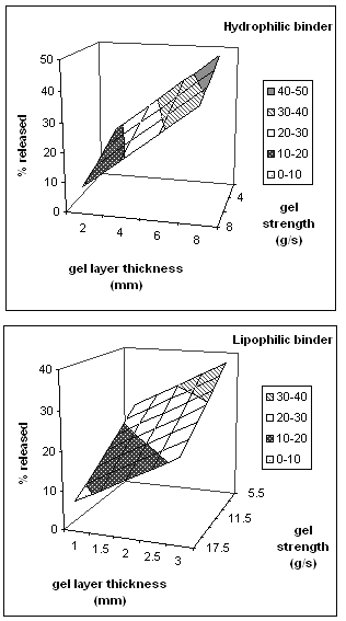 Figure 7 shows the calculated response surfaces for theophylline release from HPMC matrices as a function of gel layer thickness and texture analysis curve slope (gel strength).