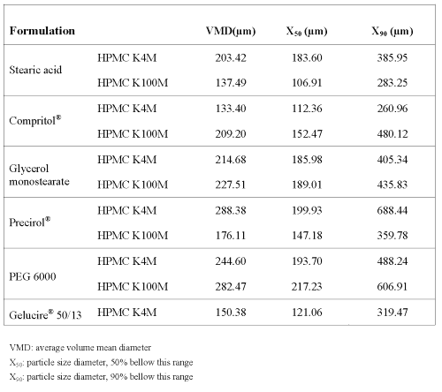As shown in table 1, particle size distribution measurements showed that 90% of the granules elaborated had diameters <690 mm, and the mean particle size values of the granules ranged between 130-290 mm for all the batches prepared. The particle size distribution was unimodal showing that the different excipients used did not influence the granules particle size. Taking flow properties into account, satisfactory values for Hausner Ratio (HR), Carr Index (CI) and repose angle (a) were obtained for all formulations. The HR values obtained were below 1.25 and repose angle was around 34º, indicating that the granules showed good flowability (22). Moreover, the values of CI were below 15%, which means that the granules have good flow properties, thus suggesting the possibility of continuous tabletting (23). However, it was not possible to compress the granules prepared with Gelucire® 50/13 and HPMC K100M.