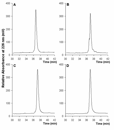 Figure 1. Effect of the heat sealing of borosilicate ampoules on the RP-HPLC profile of rhIFNa-2b. Chromatographic profiles of 1-ml samples are given in A (before sealing) and B (after sealing). Additionally, chromatographic profiles of 0.5-ml samples are given in C (before sealing) and D (after sealing).