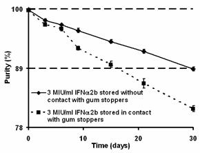 This fact clearly showed the deleterious effect of the gum stoppers on the stability of rhIFN-a2b. Two factors can be considered in order to explain this influence. The possible release of heavy metal ions to the solutions, and other degradation routes induced at the rubber-liquid interface, as explain ahead.