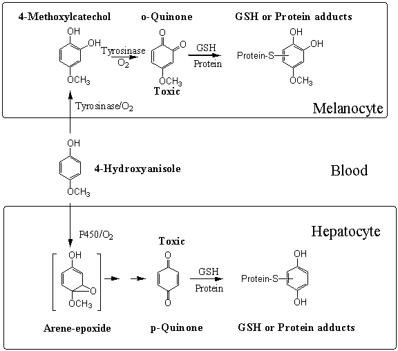 by melanocyte tyrosinase to form 4-methoxycatechol and then an o-quinone which