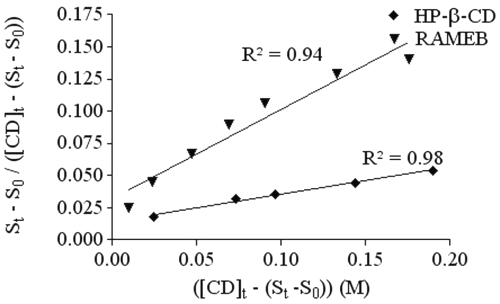 HP-b-CD and RAMEB diagrams are classified as AP diagrams. In order to determine the stoichiometry of the complexes with HP-bCD and RAMEB,