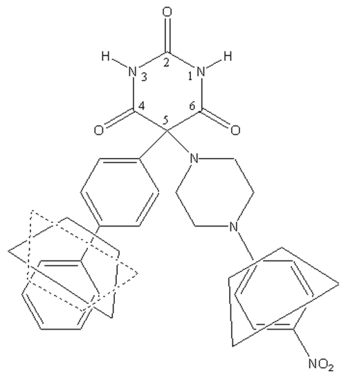 The nitrophenyl group is included by DIMEB with primary hydroxyls oriented towards the piperazin cycle, whereas the biphenyl group is included by a second DIMEB molecule, but with two possible inclusion directions, primary or secondary hydroxyls oriented towards the barbituric ring (Figure 6).