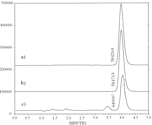Figure 8: Chromatograms obtained after injection of 30 mg/mL RO solutions freshly prepared with RAMEB as described by the phase solubility study (a), by steam sterilization process (b) and after 9 months storage at 25°C (c). The value mentioned on the left of the peak corresponds to its area