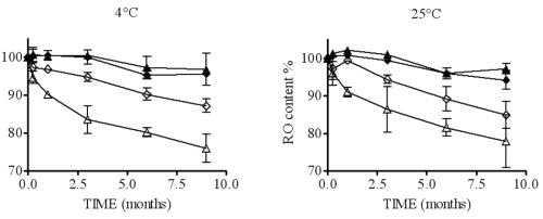 The RO content in nebulizable solutions according to time is plotted in Figure 8.