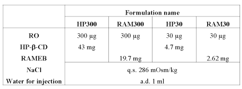 300 and 30 mg/mL RO solutions were prepared with HP-b-CD and RAMEB (see Table 4).