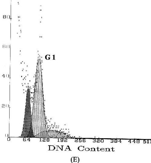 Figure 4: DNA content frequency histograms of SGC-7901cells with treatment of the methyl esters and derivatives. The Y-axis is the number of cells. Cells were fixed with ethanol and stained with propidium iodide, and then cell cycle distribution was analyzed by flow-cytometry. (A) Cell cycle following treatment with PBS. (B) Cell cycle following treatment with 5-FU. (CE) Cell cycles following treatment with the E. kansui at concentrations of 0.1, 1.0, and 10.0µg/ml, respectively.