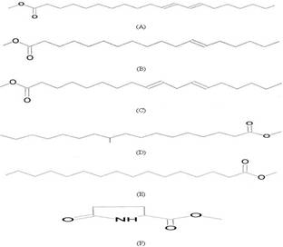 Figure 1: Chemical structures of the methyl esters and derivatives isolated from Euphorbia kansui. (A) 11, 13-eicosadienoic acid methyl ester. (B) 12-octadecenoic acid methyl ester. (C) (Z, Z)-methyl ester-9, 12-Octadecadienoic acid. (D) 10-methyl-heptadecanoic acid methyl ester. (E) hexadecanoic acid methyl ester. (F) methyl ester –5-oxo-DL-proline.