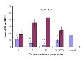The MTT assay is commonly applied as a preliminary screen to quantify cell proliferation, viability, cytoxicity, and sensitivity (14, 15). The SGC-7901 cell line at a concentration of 2.5*105 cells/ml was plated in a 96-well disposable plate containing 180µl of growth medium (RPMI 1640) per well. After incubation for 24 h at 37 oC in an incubator supplemented with 5% CO2, 20 µl of PBS, 5-FU (10 µg/ml), or the extract of E. kansui at doses of 0.1, 1.0, and 10.0 µg/ml were applied to 16 wells, respectively. The plate was incubated for 48 h at 37 oC in an incubator supplemented with 5% CO2. After the addition of 10 µl of MTT suspended in PBS (5 mg/ml) to each well, the plate was incubated for further 4 h. Then the supernatant was discarded, 100 µl solvent control (DMSO) was applied to each well, and the plate was shaken for 10 min. The optical density was read at 494 nm (OD494) in an enzyme-linked immunodetector (MULTISKAN MK3, Shanghai, China), and the inhibitory rate (IR) was calculated by the following formula: