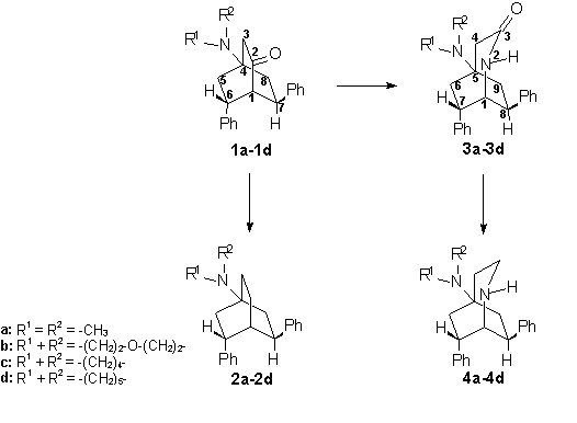 procedure yielded the bicyclic amines 2 (24). The formation of the 2-azabicyclo[3.2.2]nonan-3-ones 3 succeeded by a Beckmann