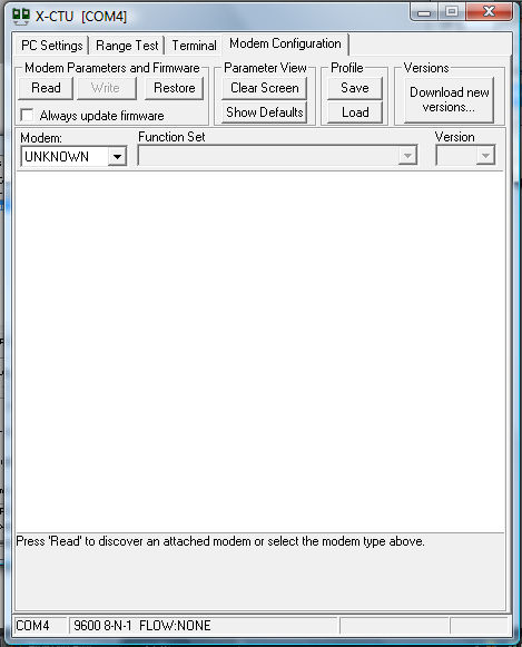 We will first set up the Base XBee: With the Base XBee connected to your computer, open X-CTU and navigate to the Modem Configuration tab.