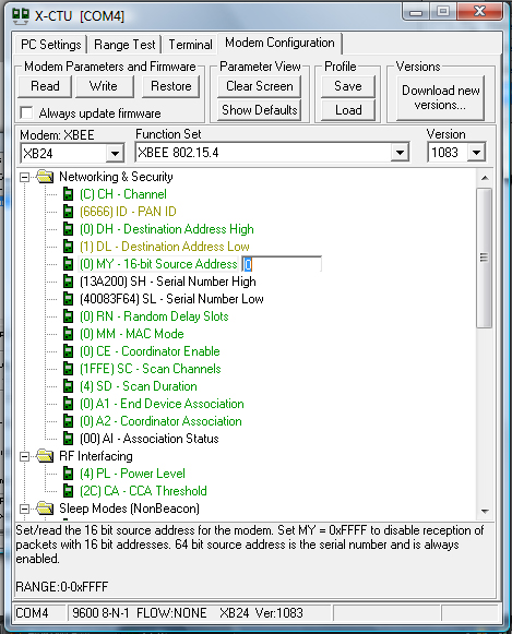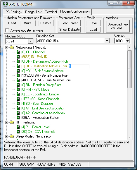 Settings for the second XBee will be exactly the same, except DL and MY will be switched. Note that DL and MY addresses does not necessarily need to be 1 and 0. They can be set to anything.