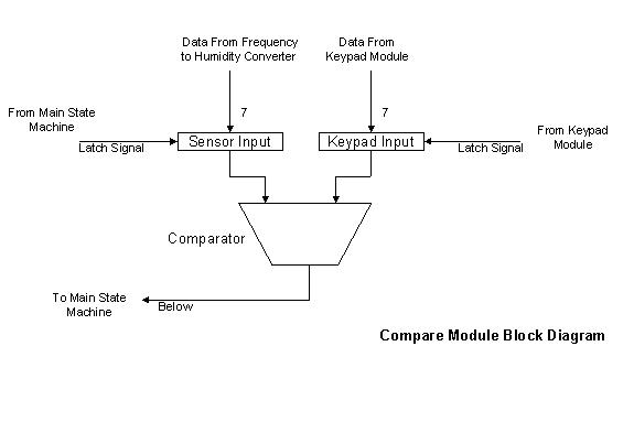 The compare module takes in as input values from the sensor and the keypad. It compares the sensor's value (the current relative humidity) to the desired set value (from keypad). The output signal below signals whether the current humidity level is below the set value (below = 1 means we are below, below = 0 menas we are ok).