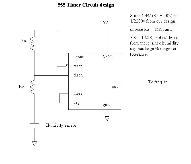The next calculation determines the range of humidity clock frequencies. The important factor is the range of capacitances of the sensor, being from 112pF (10% humidity) to 140pF (85% humidity). Please see the humidity capacitor specs. The external 555 timer circuit was used because the on-chip RC ocillator did not suit our needs, as our sensor was always below the 1000pF limit in that circuit. We did try using the RC oscillator, but the frequencies obtained were not close to what the calculation showed. The 555 timer circuit worked much better, but we had to make significant adjustments to our 2 resistors in that circuit to get the correct frequency for the capacitance of the sensor. In specific, Ra had to be decreased to under 1K, and Rb was decreased to 11K to obtain the proper frequency. If we had more time, we would have investigated this further. Since we ended up using the 555 timer for the generation of the humidity clock, the frequency f is proportional to 1/C. Thus: