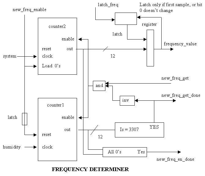There are 2 parts of the design in this portion which may need further explaining. The first one has to do with the the frequency value of the humidity sensor obtained. Imagine if the humidity is at 30.5%. Then, our output may be flopping between 30% and 31%, and our output on the display may not be readable, if it is rapidly switching between the 2 values. Also, since the system clock and humidity clock are not synchronous, then, even though the humidity is constant, the humidity count of counter1 could vary by a maximum of 1 for the constant humidity. This translates into a relative humidity change of 1% in our system as well. So again, the output may flop around between two values (eg. 30% and 31%). To solve this problem, we only record changes of 2%. Since humidity as a value which changes very slowly, a change greater than 2% will never occur between sample periods. This simplifies the design of this feature greatly. All we do is check the least significant bit of the frequency obtained from counter1. If this bit is the same as previously obtained, then we load the new value into the register. Note thus, that we record any even change (0 ,2, 4, 8 ..). This eliminates the changes of 1%, and again, since humidity changes very slowly, only changes of 2%, or 0% will be recorded. Noe also that we must ignore this feature if the sample is the very first one upon reset or powerup. To do this, we have a flip flop to output a 0 upon reset, until the first sample has occured. Then it is set to 1, and remains 1. The signal from this flip flop can be used to load the new frequency no matter what, it its output it 0.