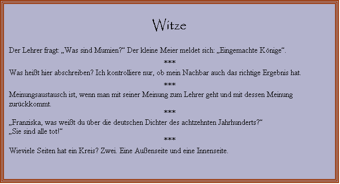 Welchen Prominenten aus den letzten Jahrhunderten schätzen Sie besonders? Wenn er oder sie in dieser Sprüche-Sammlung auftauchen sollte, dann könnte Ihre Wertschätzung auf eine harte Probe gestellt werden. http://www.sem-net.de/Der Spaß an den Zitaten, die man auf dieser Webseite findet, sollte Sie aber wieder versöhnlich stimmen. Sie können Zitate nach Rubriken wählen oder die gesamte Liste auswählen. Nach dem Anklicken eines Zitats werden vier Persönlichkeiten mit Foto zur Wahl gestellt, aus denen der Autor/die Autorin des Zitates zu wählen ist. Wenn die Wahl richtig war, erscheint ein kurzer Lebenslauf der Person. Die unfreiwillig komischen, seltsamen oder einfach nur unmöglichen Sprüche lassen sich im Internet-Unterricht in einem PC-Raum einsetzen als - kleines Recherchespiel zur Auflockerung