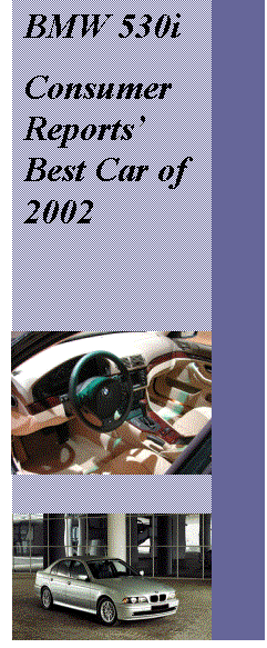 with its 530i touring sedan, which was named Consumer Reports’ Best Car Tested this week. Editors at the leading consumer product safety and quality testing organization in the U.S. wrote, “The BMW 530i combines excellent handling and exceptional comfort, advanced safety, responsive performance, and exquisite fit and finish.” The car is priced at about US$ 46,000. The Consumer Reports citation crowns what has been a glittering year for the Bavarian-based luxury-car maker. The Handelsblatt reports that, after switching to International Accounting Standards (IAS), the BMW group saw earnings from ordinary business activity rise 59.5%, to 3.2 billion euros (US$ 2.8 billion). Under Germany's accounting standards, earnings came in at 2.748 billion euros, a result that almost exactly matched analysts' forecasts. For the current year, the carmaker has already delivered – by its standards – an unusually confident forecast. Unit sales were forecast to rise to more than one million BMW and Mini cars, while sales and earnings are also seen to continue rising. Two other German car models made the Consumer Reports Top Ten of 2002 list: In the family car category, the Volkswagen Passat (US$ 26,000), and in the upscale sports sedan category, the BMW 330i (US$ 40,000). The Week in Germany, March 15, 2002 |