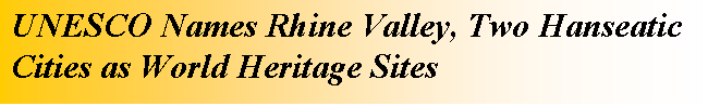 The central Rhine Valley, which stretches some 40 miles between Bingen and Koblenz, is rich in spectacular scenery. Dozens of castles and fortresses are scattered along the vineyard-clad embankments of the Rhine in this region. Although the area suffered over-tourism in the 1960s and 1970s, great pains have been taken to restore much of the romantic allure it held for poets and philosophers of the 19th century. North Rhine-Westphalia's economics minister Hans-Artur Bauckhage sees the committee's decision as a boon above all in the areas of tourism and the wine trade. "Now it is up to individuals to take advantage of the chance they have been given." Other major UNESCO sites in Germany include the cathedrals in Cologne, Trier and Speyer, the house where Martin Luther lived and died in Saxony-Anhalt, the rococo pilgrimage church Die Wies in Bavaria and Museum Island in Berlin. With the additions announced Thursday, Germany now has 27 UNESCO sites. For a complete list click on http://whc.unesco.org/nwhc/pages/sites/main.htm and scroll down to "Germany." The Week in Germany, June 28, 2002