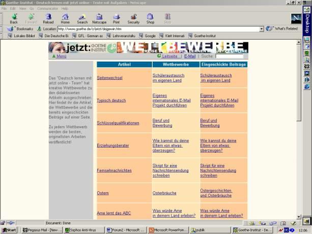 Abb. 2: Gesteuerte Wortschatz-Suchaufgabe unter Verwendung einer Suchmaschine im Internet Unterstützung des produktiven Bereichs Zu den weiteren Bausteinen der Lernumgebung gehören Aufgaben zum mitteilungsbezogenen kreativen Schreiben, Diskussionsforen wie das Lernerforum und das Lehrerforum und die Chatseite, bei der zu bestimmten Zeiten muttersprachliche Gesprächspartner zur Verfügung stehen. Dieser ‚didaktisierte’ unterscheidet sich vom nicht-didaktisierten Chat u.a. dadurch, dass er von einem muttersprachlichen Gesprächspartner moderierend begleitet wird, dass bestimmte Gesprächsthemen vorgegeben werden können und dass dafür gesorgt wird, dass penetrant gegen bestimmte Normen verstoßende Diskussionsteilnehmer den Chatraum nicht für andere Lernende ungenießbar machen (14). Zwar muss man Ergebnisse von Untersuchungen wie der von Pellettieri (2000, 83), die feststellt, dass die Lernenden in Chats "negotiate over all aspects of the discourse, which in turn pushes learners to form-focused linguistic modifications. Additionally, learners provide and are provided corrective feedback", im Hinblick auf ihre Reichweite sicher zur Zeit noch mit Vorsicht behandeln; doch im Kontext von multimedialen Lernumgebungen lässt sich festhalten, dass die Integration von Chats einen willkommenen Kontrapunkt zur Rezeptionsorientierung des größeren Teils der Lernumgebung setzt; dies macht ein Gespräch von Lernenden aus verschiedenen Kulturen über die rezipierten Texte in einer Weise möglich, die zuvor meist nur in ausgangskulturheterogenen Lernergruppen innerhalb des deutschsprachigen Raums wie z.B. in Ferienkursen oder Vorbereitungskursen für die Aufnahme an die Universität realisierbar war (15). Wettbewerbe, bei denen die Lernenden zum Verfassen von Texten animiert werden, decken den im Internet didaktisch eher unterentwickelten Fertigkeitsbereich des Schreibens ab. Dadurch, dass ein Teil der eingesandten Texte publiziert wird, besteht im Kontext des Klassenzimmers die Möglichkeit, über verschiedene Formen der Schreibdidaktik vom individuellen Schreiben über das Schreiben in Kleingruppen oder die gemeinsame Erarbeitung größerer Texte bis zu projektähnlicher Arbeit zu gelangen. Abbildung 3 gibt einen Überblick über die unterschiedlichen Wettbewerbe und die Themen, auf die sich diese beziehen.