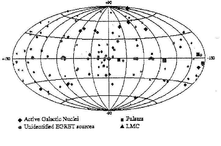 Sources detected by the EGRET detector between 100 MeV and 10 GeV.