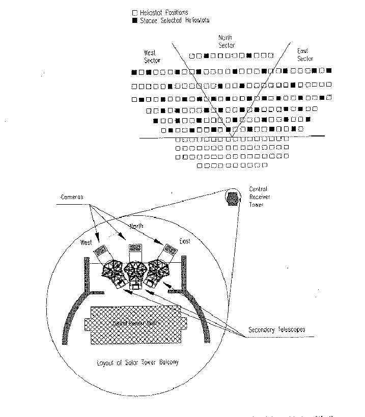 Layout of the National Solar Thermal Test Facility with the STACEE heliostats shaded. The configuration of the three secondary optical systems on the tower is shown in the enlarged portion.