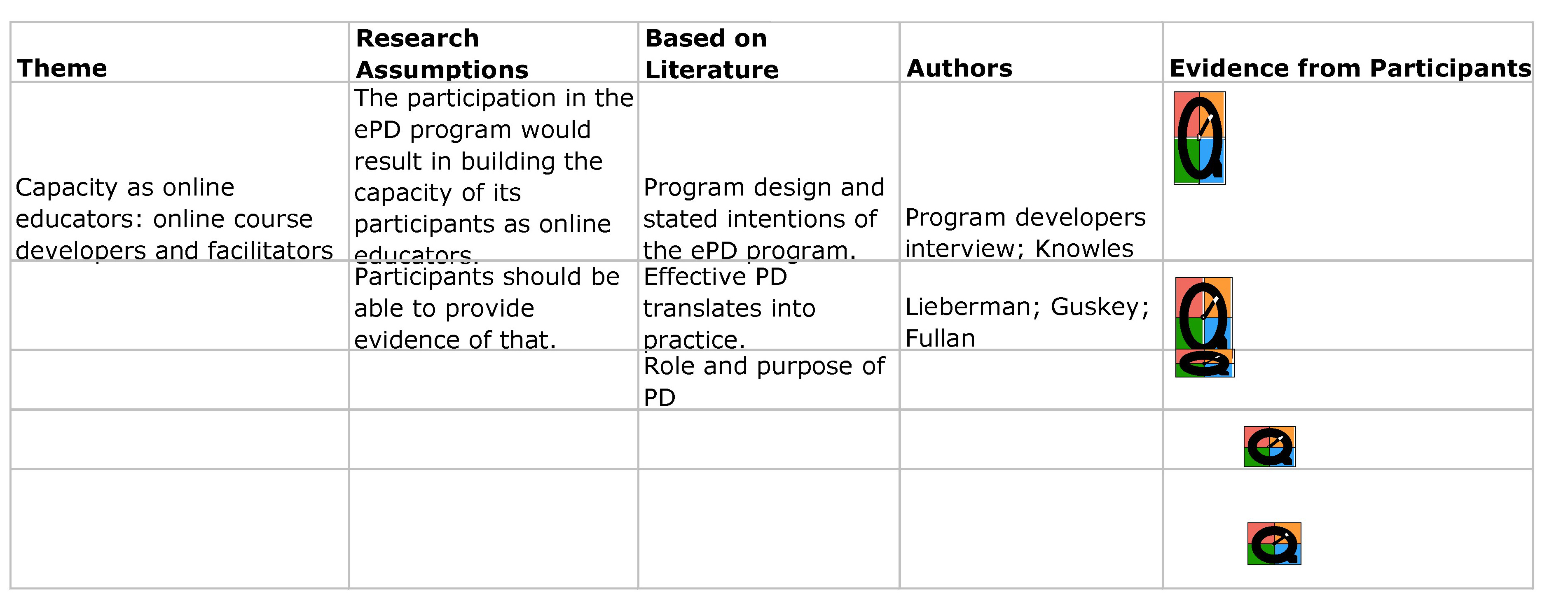 The purpose of this case study research was to develop an understanding of the phenomenon of an online professional development program for online teachers, called ePD, offered by Innovative Learning Services (ILS) of the Calgary Board of Education in Alberta, Canada (Childs, 2004). In an attempt to provide a holistic account of the real-life phenomenon of online professional development for online educators, we used frame and code analysis, mentioned briefly above, in this case study research design (Goffman, 1959, 1974) which was informed by principles of ethnography. This approach facilitated a research process [that] is one of constant interaction between problem formation, data collection and data analysis . . . [and] brings a variety of techniques of inquiry into play . . . [and one in which] the observer is the primary research instrument (Walsh, 1998, p. 221).