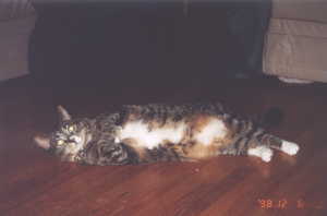| Occasionally, Tigger will lounge around the house, all stretched out, belly up, and paws in prayer position. She'll then go on to look at you in a quizzical fashion, the end result being that she looks funny and cute. |
