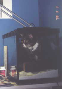 Chris also has a gecko as a pet (sorry, no pictures of the gecko...it's a rather boring creature). One day, when Chris had taken the gecko out of its aquarium to show a friend, Tigger got curious. She squeezed herself through a 10cm by 16 cm rectangle, and landed herself in the aquarium. Either she liked being in the aquarium, or she couldn't get out herself, but either way she was rescued when we took the top off the aquarium and lifted her out. |