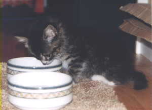 Tigger is named in honor of my favorite Disney Winnie the Pooh character. Although she's not bright orange, she does bounce around sometimes, making her look very funny and cute. Her distinguishing features are her big round eyes, and her tail, which is a bit on the short side and has a flattened end instead of the usual tapered tail that most cats have. Chris brought her home from the SPCA about three years ago, and since then she's taken over his chair, along with quite a few other places in the house. Very smart, she's got everyone's schedule figured out, and has the nerve to shove open doors should she want to go in the room.