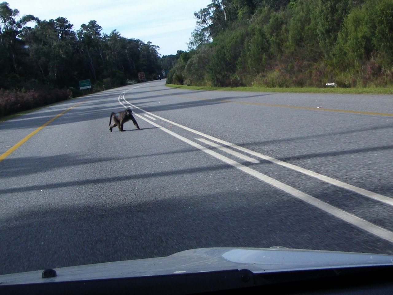 Baboons and poor black people are both highway hazards. The apartheid equation: black people = baboon-like. Sad truth -- the poor black people are only walking on the highway because apartheid dictated where they had to live. |