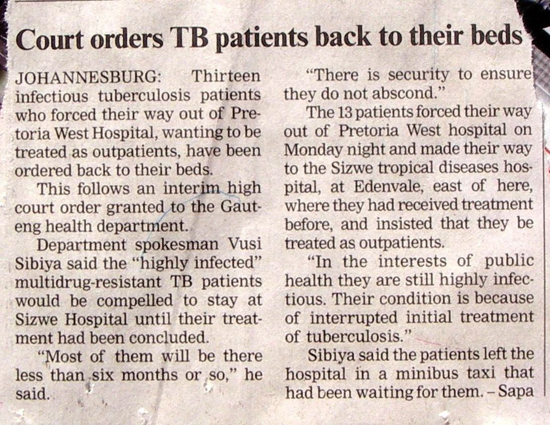 Health in South Africa is also in crisis, again due primarily to the inequities of apartheid and daily African life. HIV and TB are cutting the life expectancies of black South Africans to half that of their wealthy white compatriots. Why is the situation so bad, and what can be done about it? One thing to understand is the relation between TB and HIV. Tuberculosis, the "red snapper" under a microscope, is an elusive bacteria that spreads through the air (particularly in the cramped quarters that most poor people in townships live), is very hard to kill and requires a complex immune response to contain. Most people exposed to TB don't get very sick, just a flu-like illness, because the body's T-cells act with other immune cells called macrophages to identify and surround the TB bacteria in "granulomas", isolation wards within the body, often found at the apices of the lungs. If at any time your immune system weakens (stress, diabetes, old age or other illness), the TB bacteria can overwhelm the body's defences and produce severe and lethal illness, the weight loss and gradual death once called "consumption". The HIV virus, spread primarily sexually (via a lack of education, lack of rights for women who have no chance to insist on using condoms, and male promiscuity in a society which has historically separated male workers from their families for extended periods), unfortunately has its main effect on those T-cells which would otherwise be controlling TB. And since HIV takes so long (at least 7 years) to do enough damage to T-cells to cause obvious symptoms, "healthy" young men are out there spreading the disease widely amongst the women of the township. Really disturbing is the belief that if you have sex with a virgin you will be cured of HIV -- which leads directly to distressingly common child rape. |